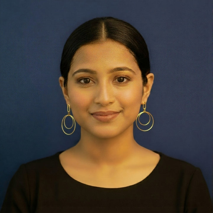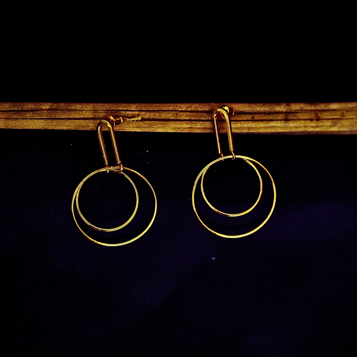 The design features dual concentric hoops — a smaller circle nested within a larger one, suspended delicately from a slim gold hook. This layered style adds dimension without appearing bulky, making it perfect for everyday wear. The circular symmetry enhances facial contours, providing a polished, balanced appearance.