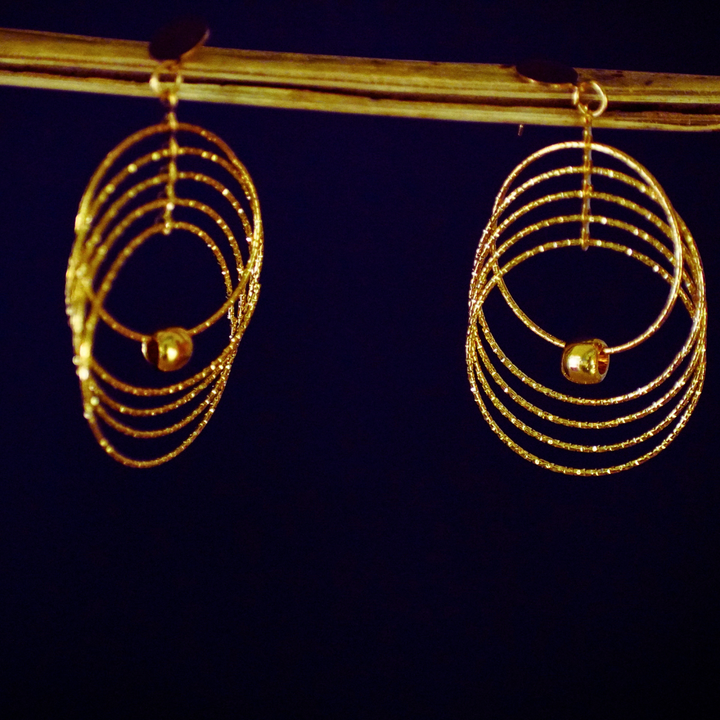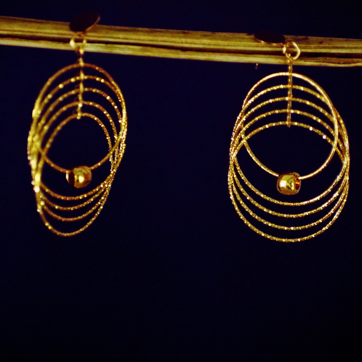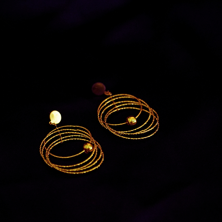 These earrings feature a mesmerizing spiral shape, resembling concentric rings that give a floating illusion. The glossy gold tone is bright yet subtle, exuding timeless sophistication. The metallic finish adds shine that perfectly matches festive or party lighting.