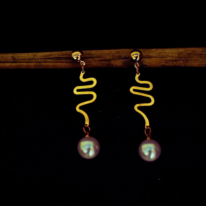 The earrings feature a radiant golden hue that complements every skin tone. The gold plating adds a subtle gleam without appearing too bold, ideal for those who prefer elegance over extravagance. At the end of each wavy drop hangs a white round pearl, adding sophistication and charm.